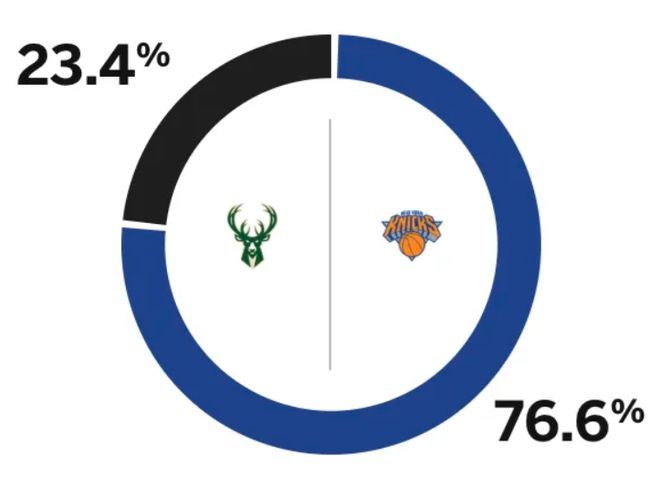 赛前,美媒ESPN对本场比赛进行了胜率预测,尼克斯胜率高达76.6%,雄鹿胜率则仅有23.4% ,差距非常明显。