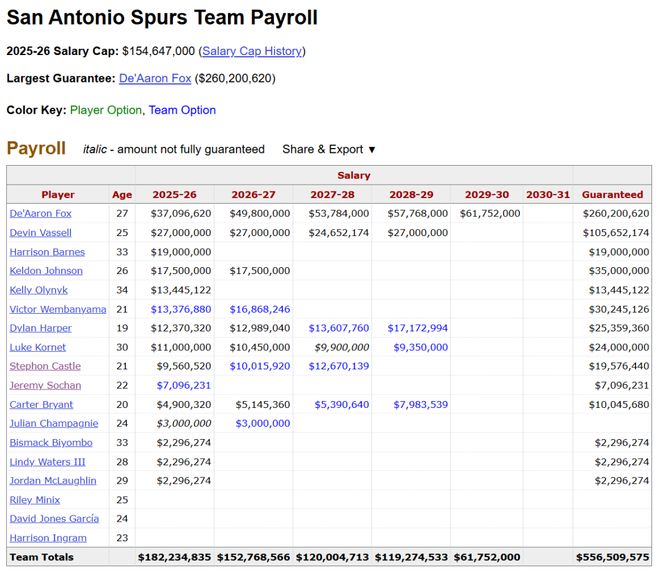 至于争议最大的福克斯顶薪占空间问题,且不说先买来福克斯、后选中哈珀的时间顺序(文班在交易后坦言“福克斯为我们带来了很多优势,我们的目标更容易实现了”),考虑到NBA球队的薪资空间随着新转播合同水涨船高、今年光是2亿以上的球队就有10支,卡斯尔和哈珀的新秀合同要延续到28、29年,巴恩斯和奥利尼克合计3200万的合同明年就到期......就算文班提前签下超级顶薪,和福克斯年均吃下1.2亿,马刺也有空间补强,更不用说潜在的交易选项了。