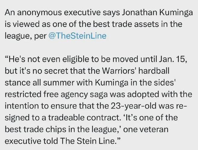 勇士当前最好的交易筹码,莫过于23岁的库明加。名记Stein之前更是表示,库明加被视为联盟最具交易价值的筹码之一,明年1月15日起即可被交易,到时勇士或许就有大动作。