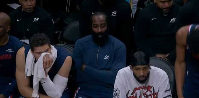 在快船末节追到15分的时候,哈登穿着训练服坐在替补席双眼无神望着场上的情况。在最后一节,快船队的4个主力球员都回来了,只有哈登还在替补席上。