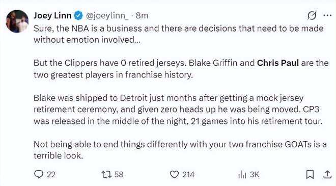 快船记者Joey Linn写道:NBA是商业联赛,有些决策不需要带有个人情噶,快船队史甚至还没有退役过球衣,格里芬、保罗都是快船队史最出色的球员,他们都明确表态愿意在快船退役,可快船管理层都对他们进行了清理,交易格里芬,裁掉保罗,我无法认同快船的行为,他们对两位球队代言人的道别非常糟糕。
